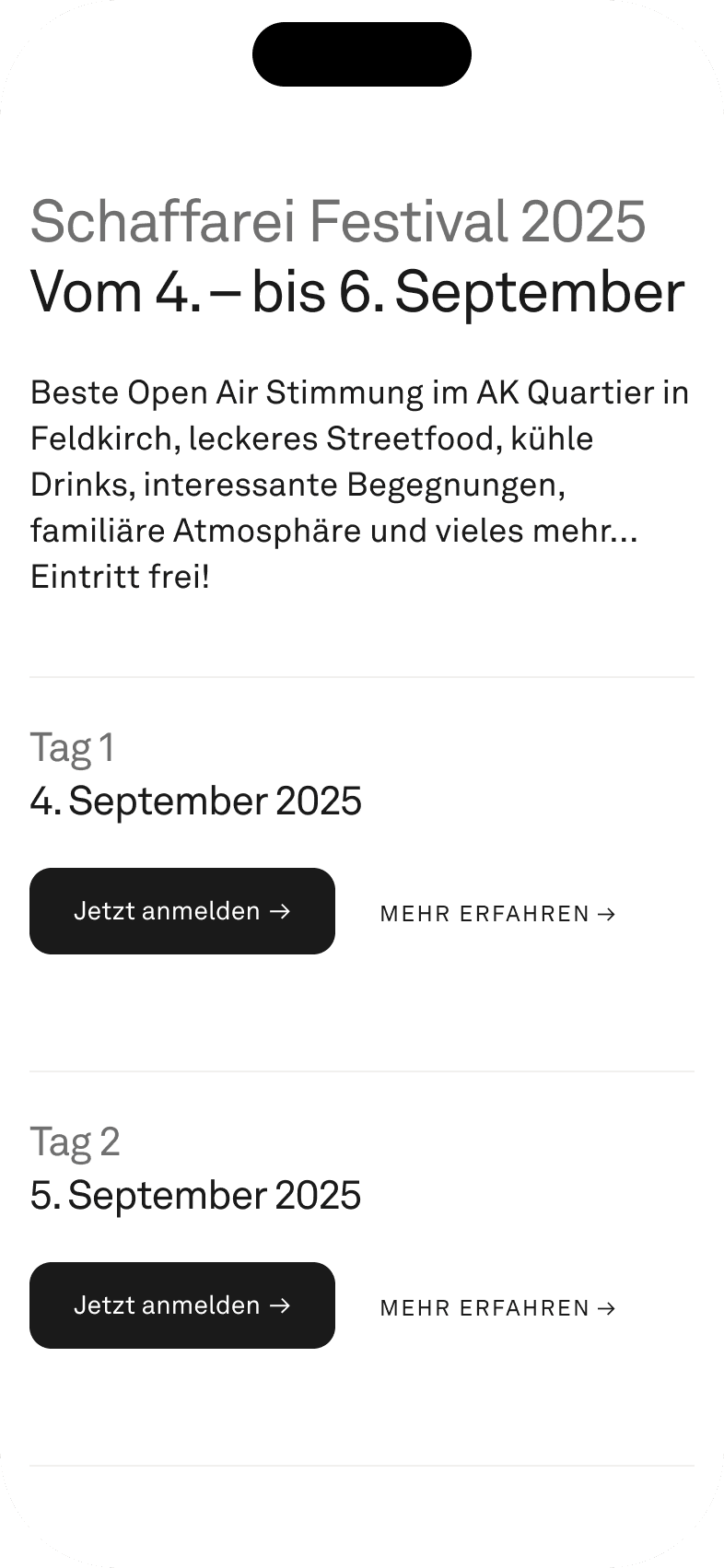 Das Schaffarei Festival als saisonales Event ist bewusst nicht dauerhaft in der Hauptnavigation integriert. Stattdessen wird es nur im entsprechenden Zeitraum ausgespielt.